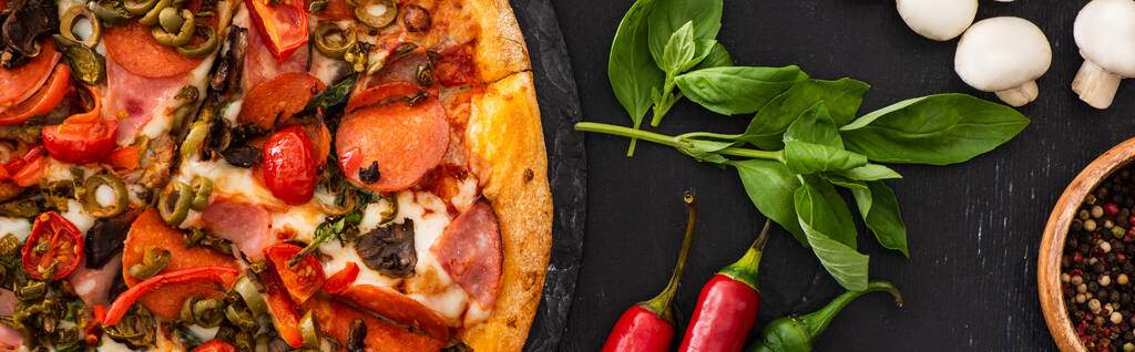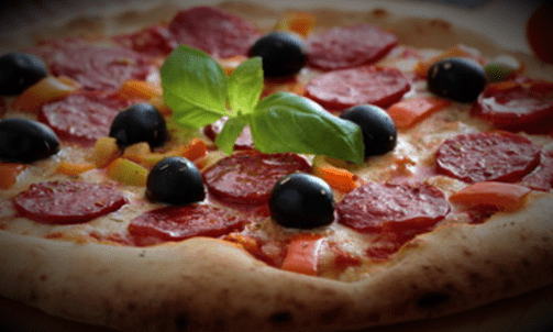 Pomodoro, Mozzarella, Salame piccante, Gorgonzola, Peperoni e Olive nere