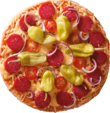 Pomodoro, Mozzarella, Salame piccante, Cipolla e Peperoni