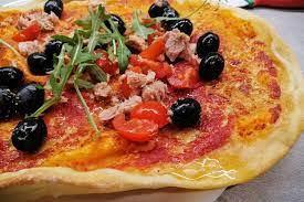 Mozzarella, Tonno, Pomodorini, Olive nere, Rucola, Cipolla e succo di limone