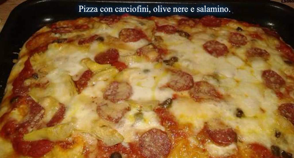 Pomodoro, Mozzarella, Salame piccante e Carciofini
