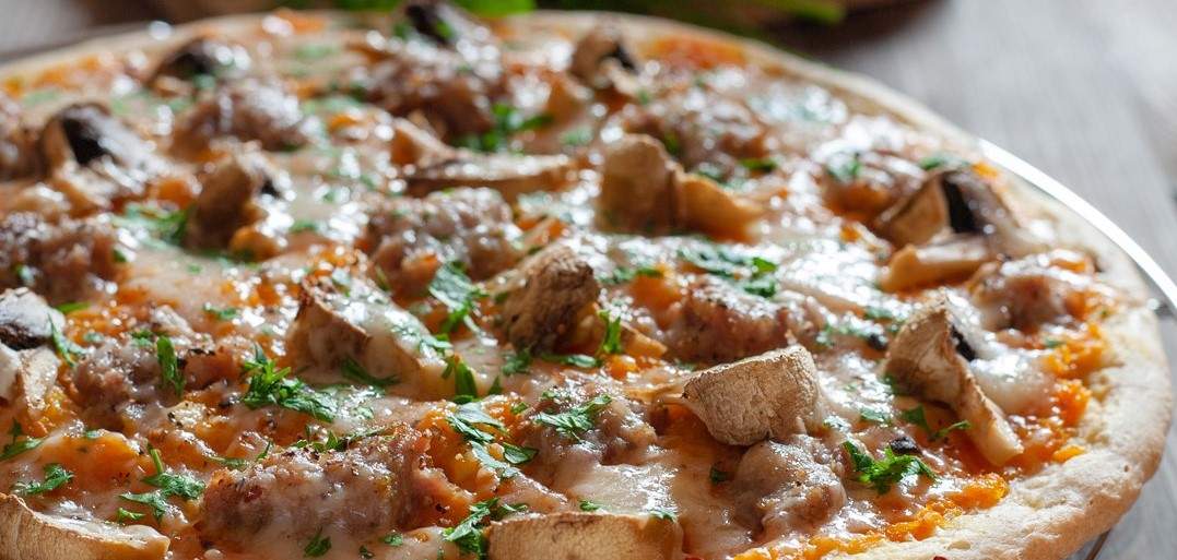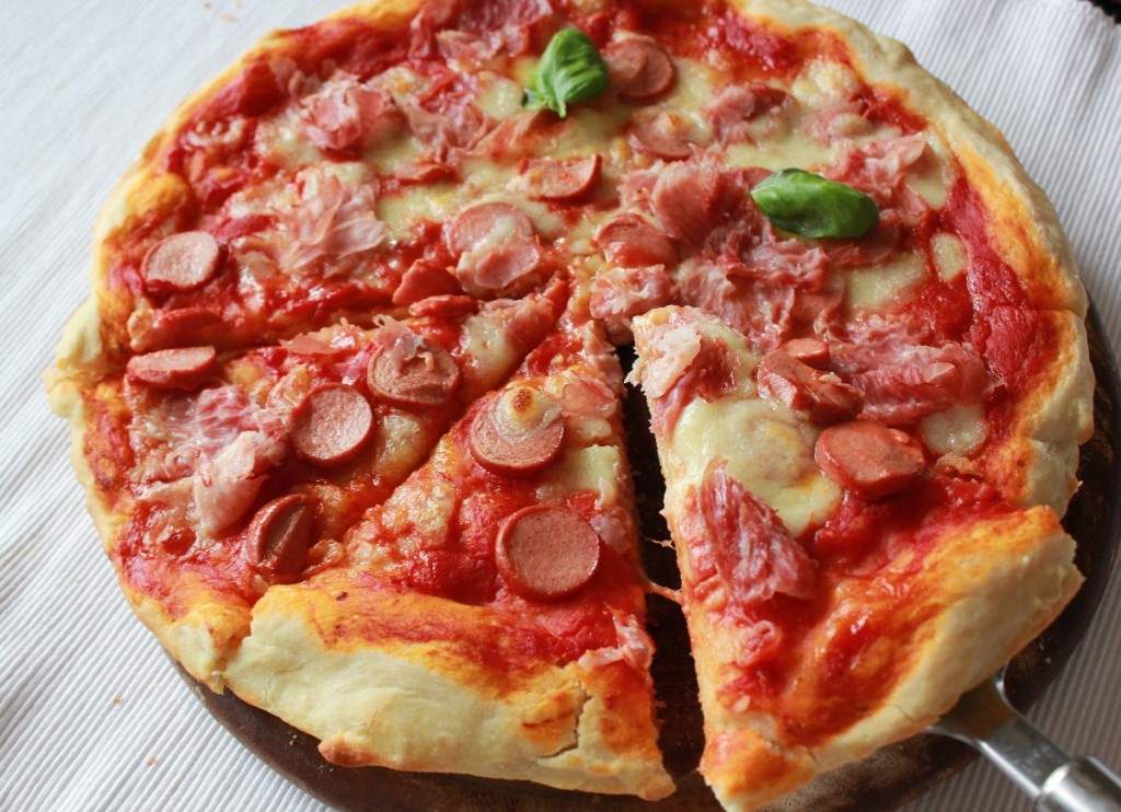 Pomodoro, Mozzarella, Funghi freschi, Prosciutto cotto, Carciofini e Salsiccia